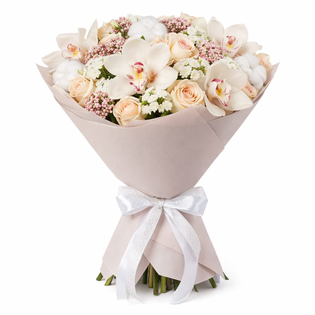 Этот букет вызывает ощущение нежности и чистоты благодаря белоснежной гамме. В его составе белая орхидея, кремовая роза, белая статица, озотамнус и хлопок. Упакован в элегантную матовую плёнку и перевязан белой атласной лентой. Композиция создаёт атмосферу утончённой романтики. Подойдёт для поздравления жены на День Святого Валентина.