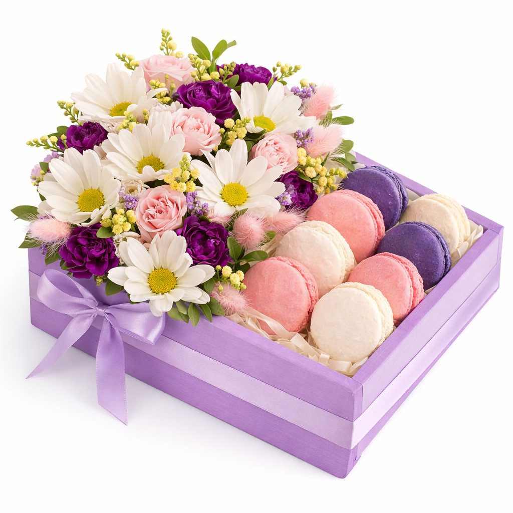 Эта композиция поражает гармонией белых ромашек, фиолетовых гвоздик и жёлтой кустовой хризантемы, создавая атмосферу радости и свежести. Цветы дополнены лагурусом и солидаго, а также изысканными макаронами. Упаковано в элегантную коробку с оазисом. Подойдёт для романтического вечера для любимой женщины.