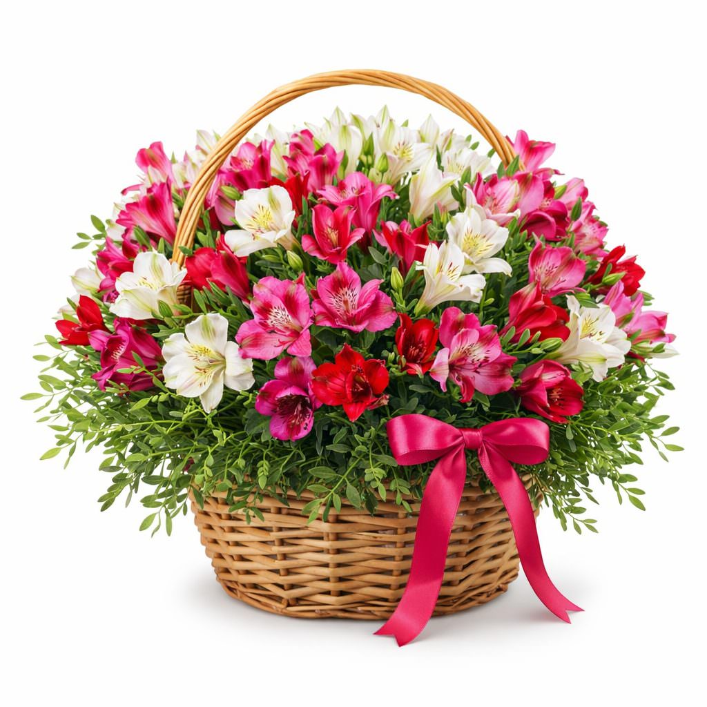 Яркие оттенки белых, розовых и бордовых альстромерий создают атмосферу радости и свежести. В составе букета альстромерия микс и фисташка. Композиция оформлена в плетёной корзине с удобной ручкой. Подарок идеально подойдёт для поздравления партнёрши на долгожданную встречу.