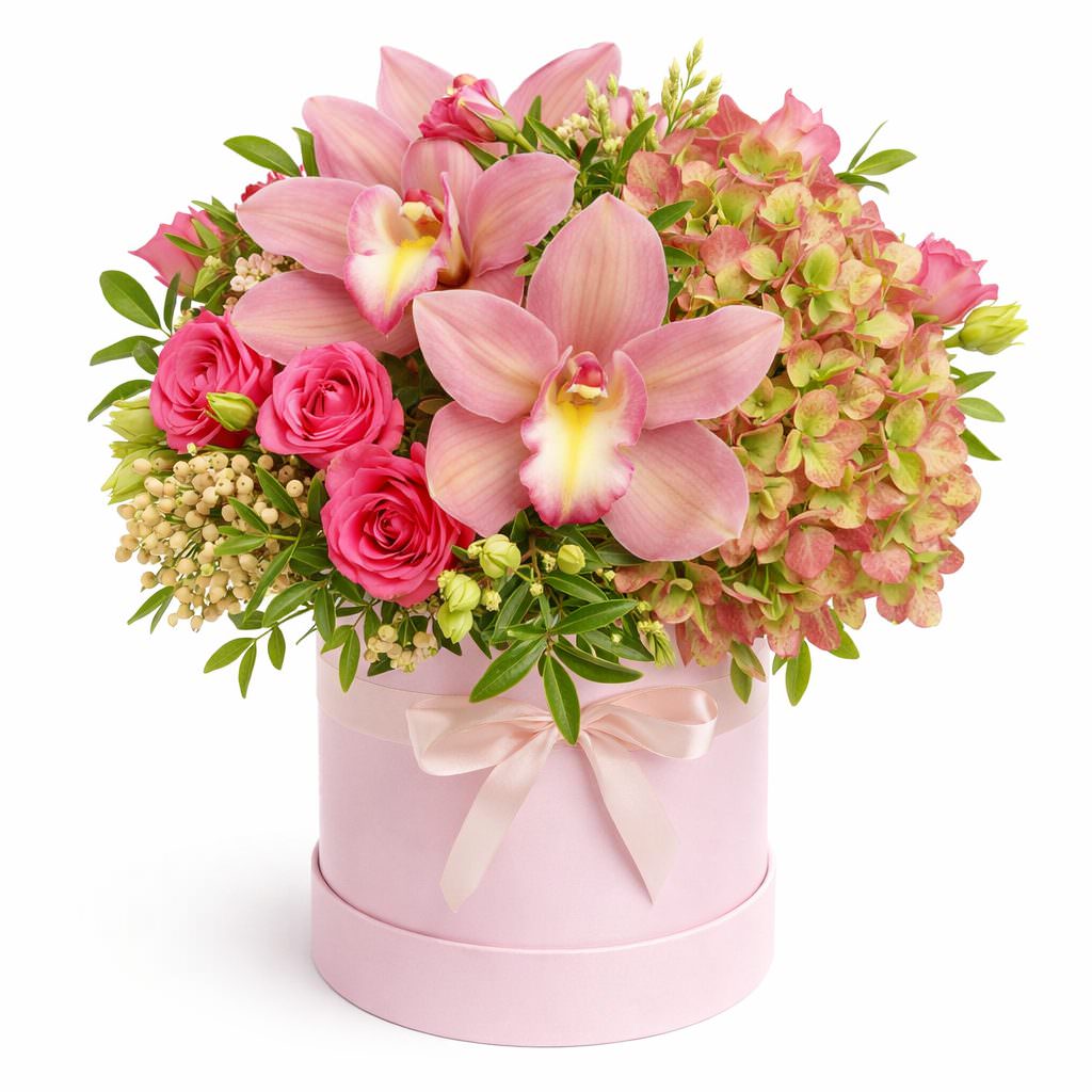 Эта композиция в нежных розовых и зелёных тонах наполнена орхидеями, розами, гортензиями, эустомами и брунией. Цветы расположены в стильной розовой шляпной коробке, создавая атмосферу романтики и лёгкости. Этот букет станет идеальным подарком для подруги на День матери, принося радость и нежность в каждый дом.